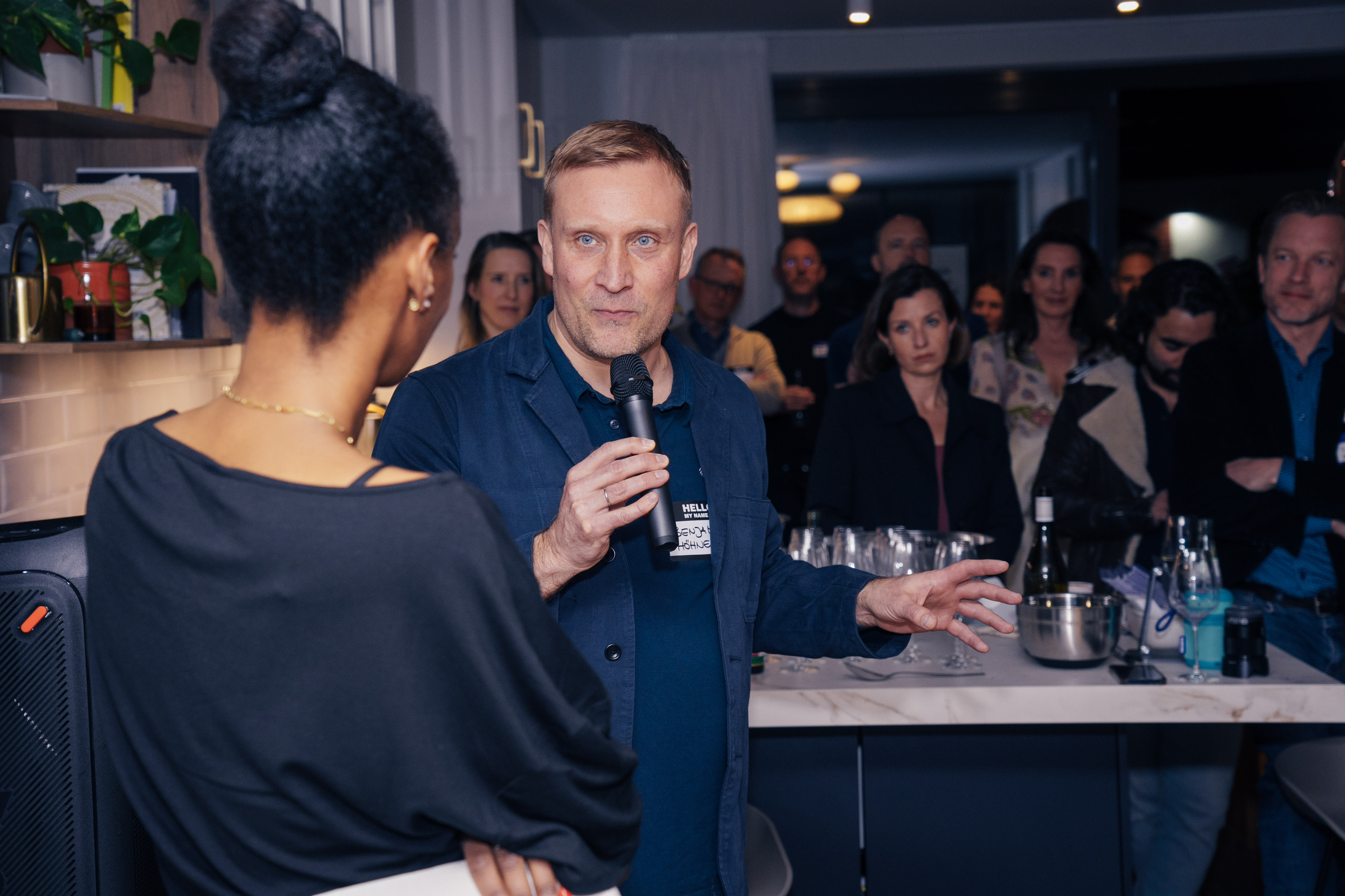 Am 3. März 2026 lud Axumawit Berhe zu einem Demokratie-Salon in Berlin Mitte ein. Der erste Speaker des Abends war Benjamin Höhne, der über aktuelle Herausforderungen der Demokratie sprach. Weitere Speaker waren der Europaabgeordnete Damian Boeselager, die Unternehmerin Verena Pausder und Anna Auerbach, die bei der Berliner Abgeordnetenhauswahl 2026 als Spitzenkandidatin für die Partei Volt antritt. (Foto: Gerald Schömbs)