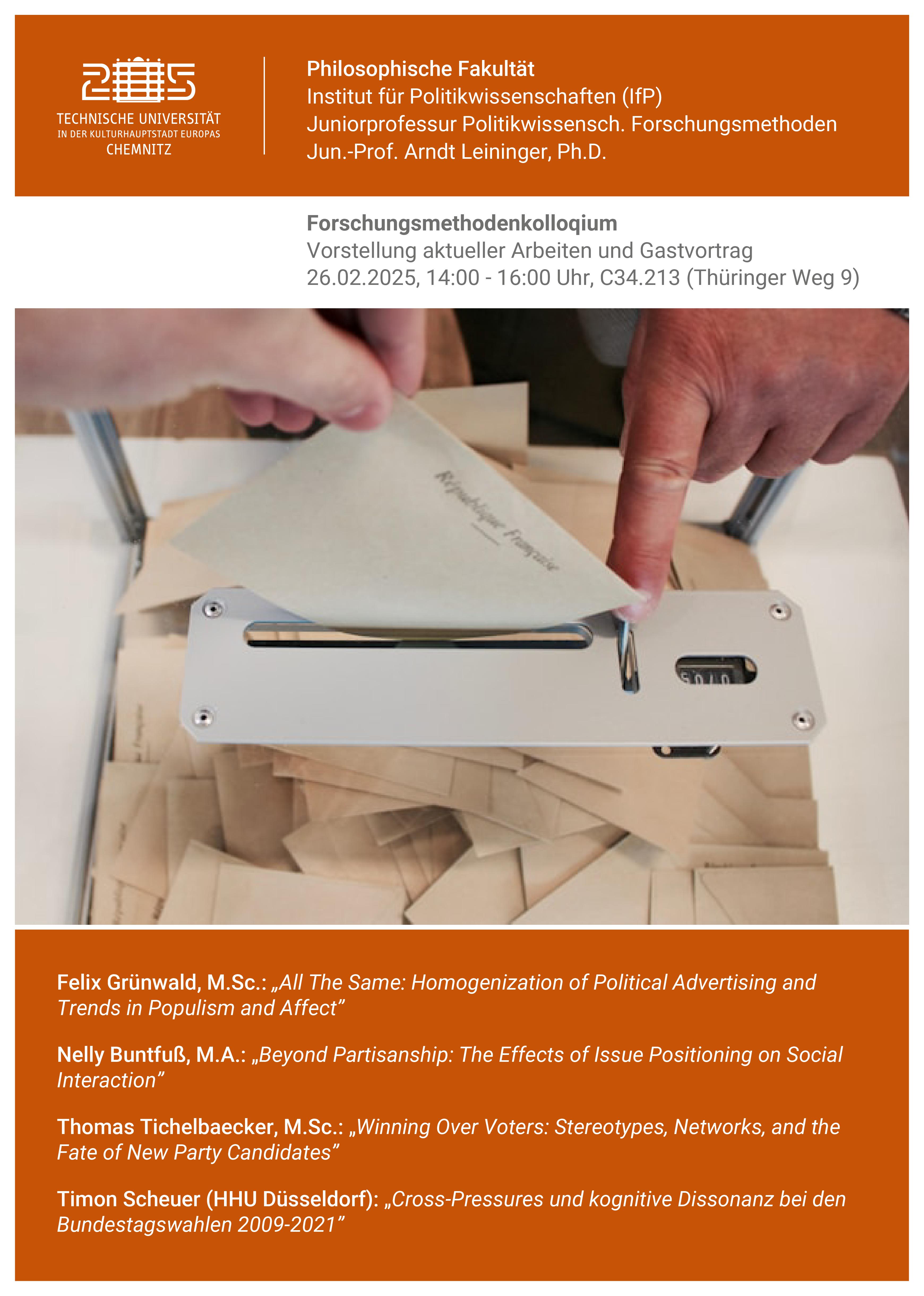 New Event: Research methods colloquium and guest lecture by Timon Scheuer about 'Cross-Pressures and cognitive dissonance in the 2009-2021 federal elections'. In addition, current research contributions by Felix Grünewald, Nelly Buntfuß and Thomas Tichelbaecker. On 26 February 2025 from 14:00 to 16:00 in Thüringer Weg 9, Room C34.213 (old: 2/TW9/213).