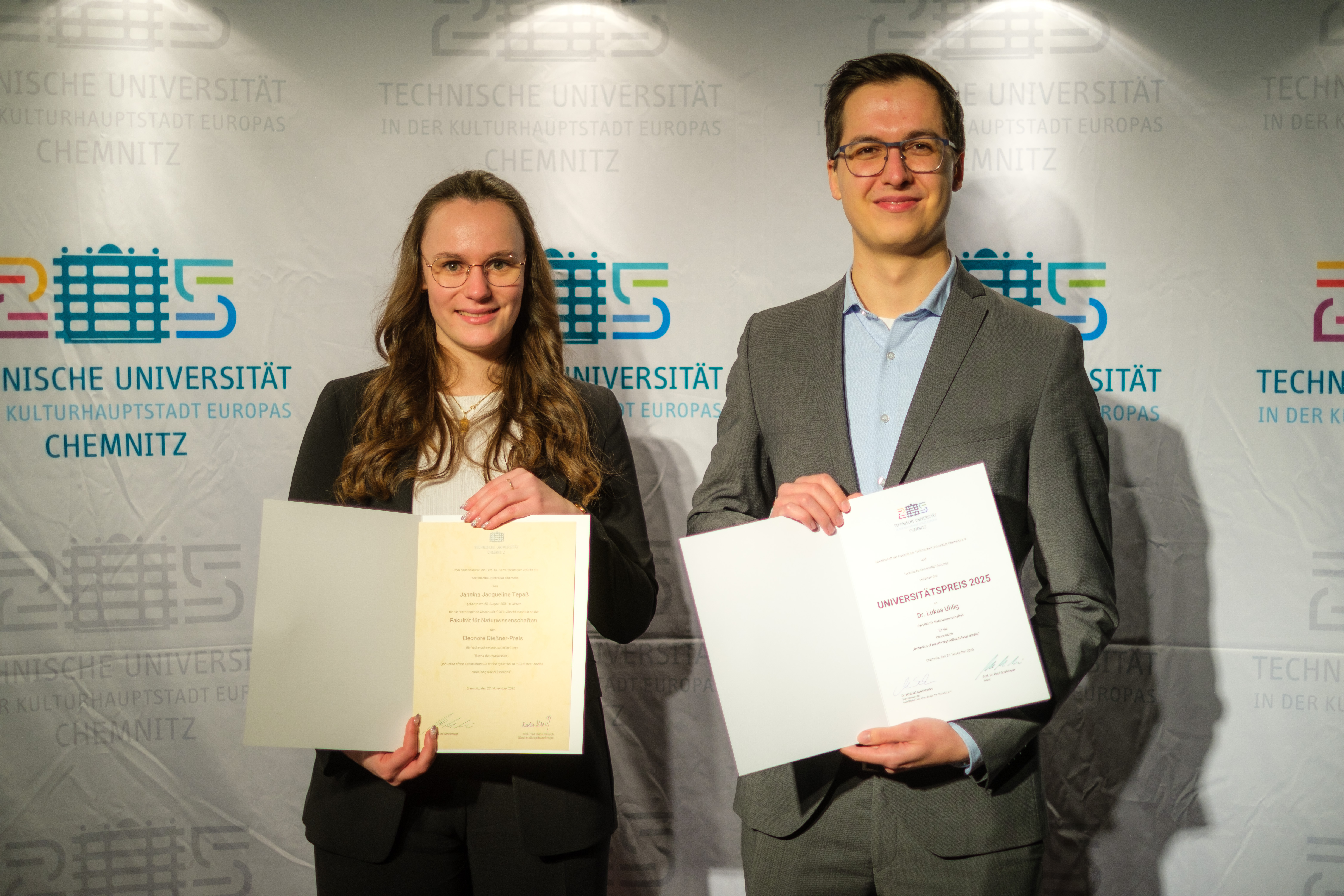 On November 27, 2025, Chemnitz University of Technology held its annual awards ceremony for graduation, teaching, research, and transfer prizes. A total of 28 prizes were awarded. Members of our group received this year's awards from the Faculty of Natural Sciences. Dr. Lukas Uhlig received the University Award for his dissertation on “Dynamics of broad-ridge AlGaInN laser diodes.” Jannina Tepaß received the Elonore Dießner Award for her master's thesis on “Influence of the device structure on the dynamics of InGaN laser diodes containing tunnel junctions". (Link zum Presseartikel der TU Chemnitz)