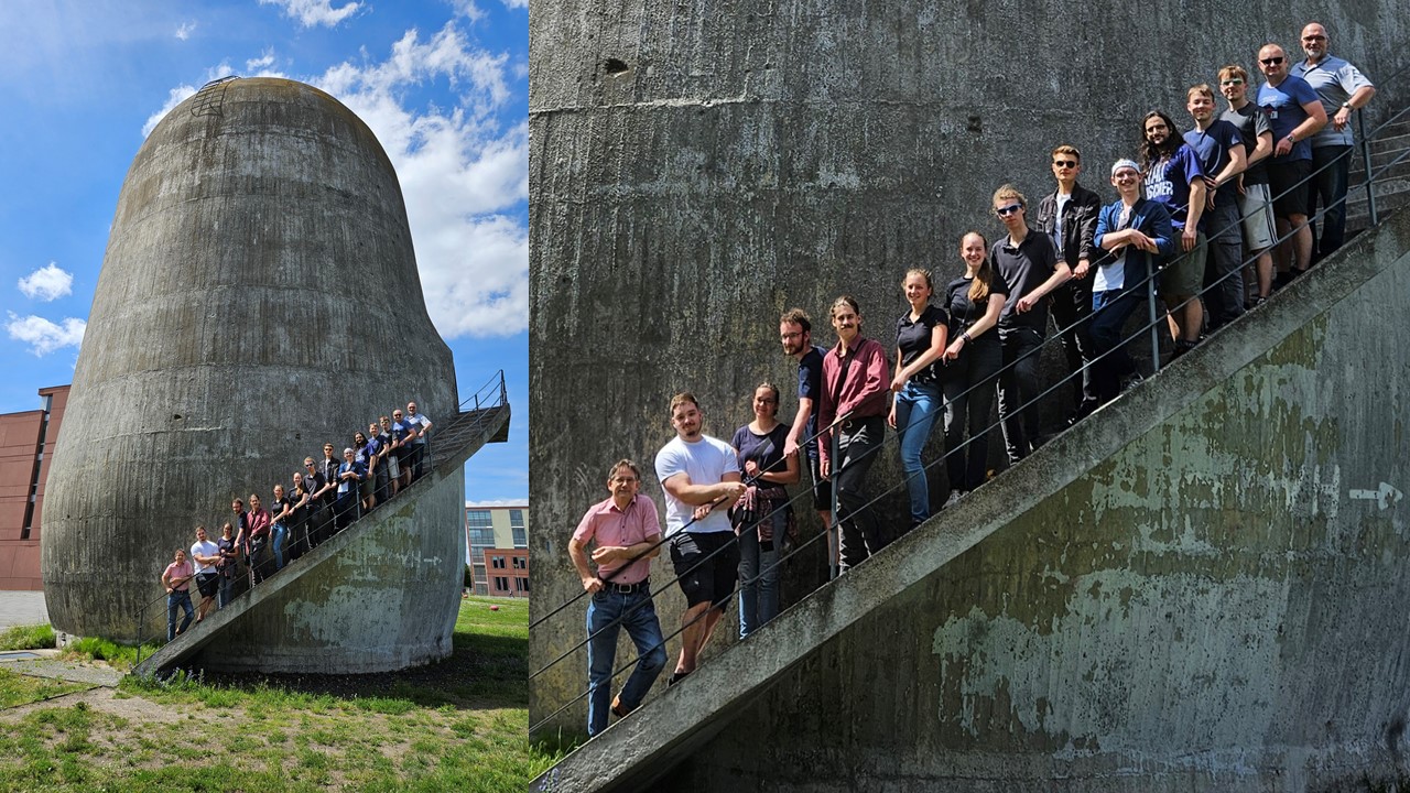 Die zweitägige Tutoriumsexkursion – organisiert von Prof. Olav Hellwig und Prof. Ulrich Schwarz – mit Studierenden der Physik zum Forschungs-Campus Adlershof im Südosten Berlins war ein voller Erfolg. Am ersten Tag wurde das Ferdinand-Braun-Institut, ein Leibniz-Institut für Höchstfrequenztechnik besucht, wobei die Entwicklung von Diodenlasern und Leuchtdioden im Mittelpunkt stand. Anschließend blieb noch genug Zeit, um das schöne Wetter in Berlin zu genießen und gemeinsam in einem italienischen Restaurant das EM-Spiel der deutschen Nationalmannschaft zu verfolgen. Der zweite Tag der Exkursion startete am nächsten Morgen mit dem Besuch der Physikalisch-Technischen Bundesanstalt (PTB) mit der zugehörigen Metrology Light Source (MLS) und dem Synchrotron BESSY II, wobei die Metrologie (d.h. die Wissenschaft des Messens) mittels Synchrotronstrahlung ein Hauptthema war. Unter anderem stand hierbei die Neudefinition des Kilogramms über eine perfekte Siliziumkugel sowie die Metrologie und Kalibrierung von Modulen für das Röntgenteleskop ATHENA (Advanced Telescope for High ENergy Astrophysics), welches nach heutiger Planung im Jahre 2037 ins All gebracht werden soll, im Fokus. Zum Abschluss der Exkursion gab es einen Rundgang durch den Forschungs-Campus Adlershof, bei dem auch die historischen Gebäude aus der aerodynamischen Ära der 1930er Jahre besichtigt wurden. Dabei entstand auch das Gruppenfoto am sogenannten "Trudelturm", wo früher das Trudelverhalten von Flugkörpern studiert wurde.
