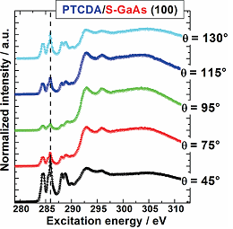 Figure 3 presents carbon K-edge NEXAFS spectra of a PTCDA film as a function of photon incidence angle, Θ. The features located at 284-290 eV and above 290 eV represent π* and σ* resonances, respectively. Their relative intensities can be used to determine the molecular orientation. |