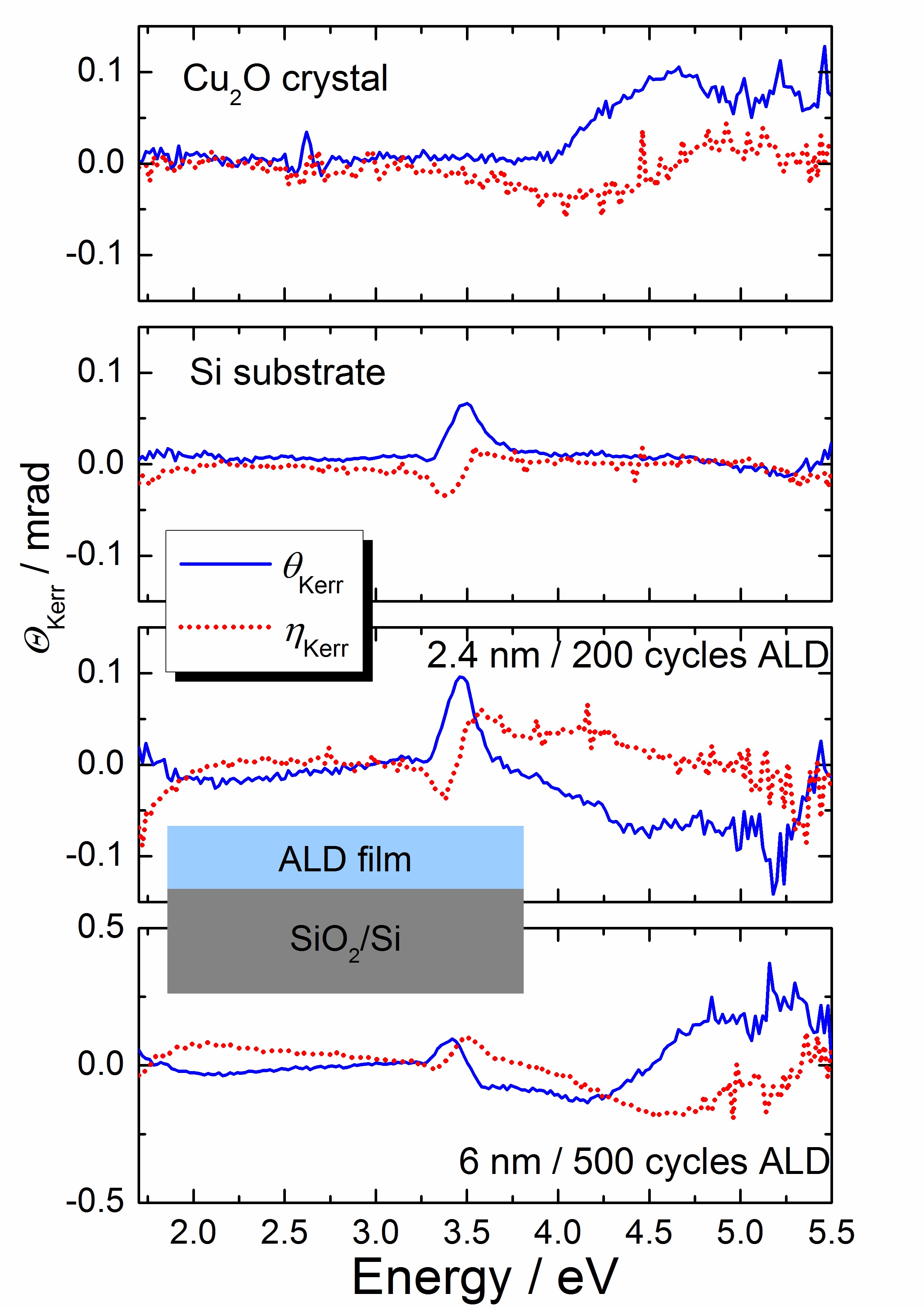 Magneto-optical properties of transition metal oxides: Cu2O is a diamagnetic material, which exhibits magneto-optical activity in the region of the excitonic transitions (Phys. Rev. B, 84 (2011) 195203). Based on the shape of the MOKE spectral features, information on the crystalline quality can be obtained even for nanometer thin films. (Microelectron. Engin., accepted, DOI: 10.1016/ j.mee.2012.10.023). The ALD films were produced at the Fraunhofer Institute ENAS. |
