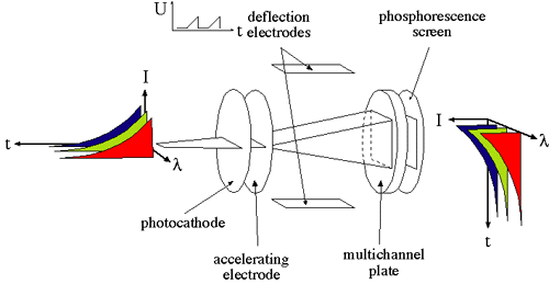 Das Bild links zeigt den Prinzipaufbau eines Streak-Scopes. Das emittierte Licht einer Probe gelangt dabei auf eine Photokathode. Hier werden Elektronen herausgelöst. Diese Elektronen werden beschleunigt und gelangen zwischen zwei Ablenkelektroden. An diesen Elektroden liegt ein sägezahnartiger zeitabhängiger Spannungsverlauf an. Die Ablenkspannung lenkt Elektronen die zu verschiedenen Zeitpunkten ausgelöst wurden unterschiedlich stark ab. Dadurch entsteht auf einem Phosphoreszenzschirm ein spektral und zeitlich aufgelöster Verlauf der Emissionsintensität. |