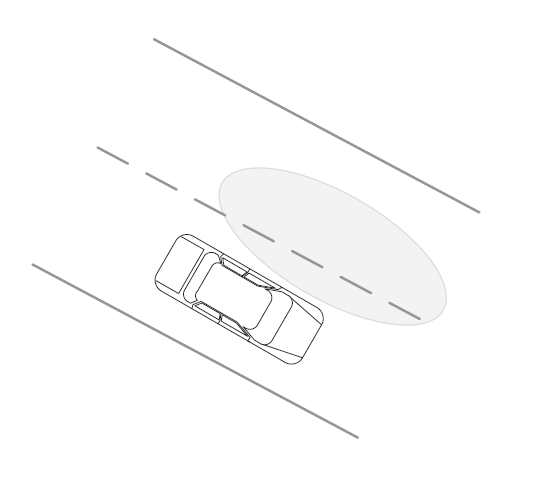 Diese Grafik zeigt deutlich, dass die wahre Position des Fahrzeugs (Empfänger) und die geschätzte Position, dargestellt durch die Ellipse, von einander abweichen. Die Integrität der Schätzung ist somit verletzt, da sich der Empfänger weit von der tatsächlichen Position befindet. Dies bringt typische Fehler innerhalb in sicherheitskritischer Applikationen eingesetzten Navigationssystemen.