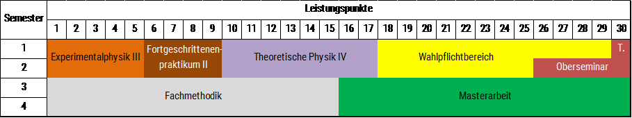 Aus einem breiten physikalischen und nichtphysikalischen Angebot ist ein Modul zu wählen, welches nicht bereits im Bachelor-Studiengang belegt wurde. Dieses vertieft z. B. das Wissen in den Gebieten:
