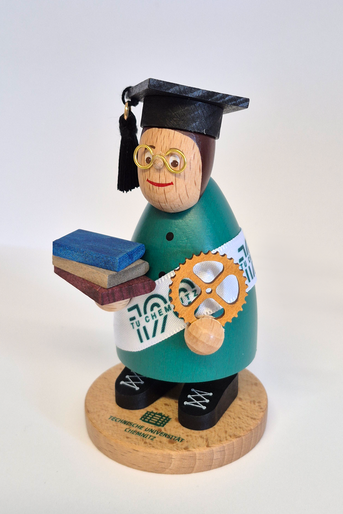 Die handgemachten Räucherfiguren stammen aus dem schönen Seiffen im Erzgebirge und wurden individuell für die TU Chemnitz von der Erzgebirgischen Volkskunst Richard Glässer GmbH gefertigt. - Artikelnummer: 980635