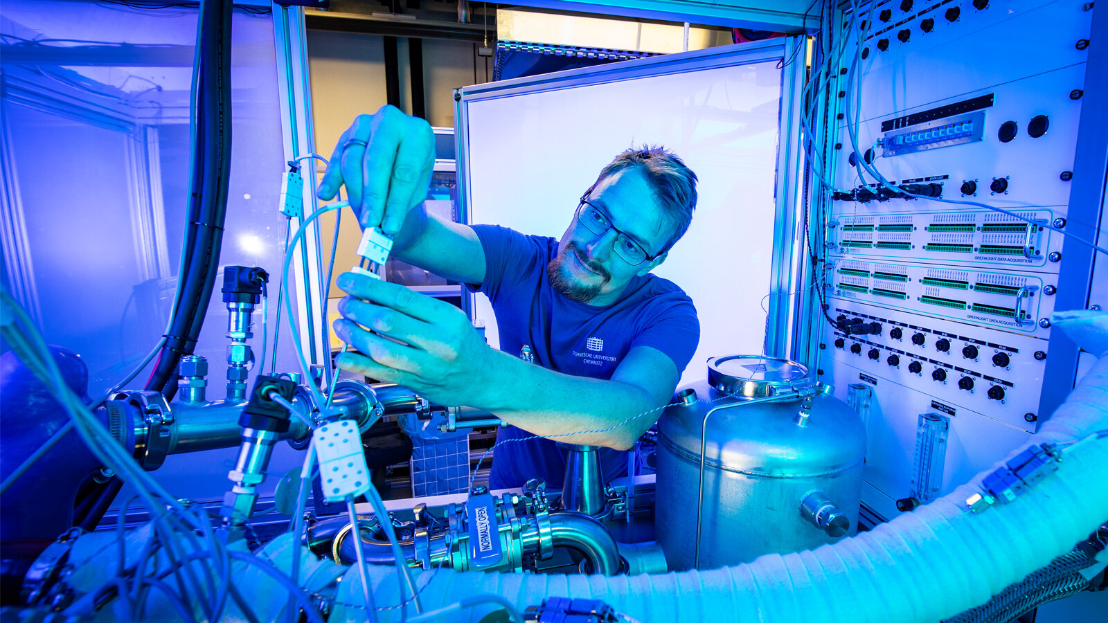 Auch an der TU Chemnitz wird intensiv zu Brennstoffzellen und Wasserstofftechnologien geforscht, unter anderem im Brennstoffzellenlabor der Professur Alternative Fahrzeugantriebe (ALF). Foto: Jacob Müller