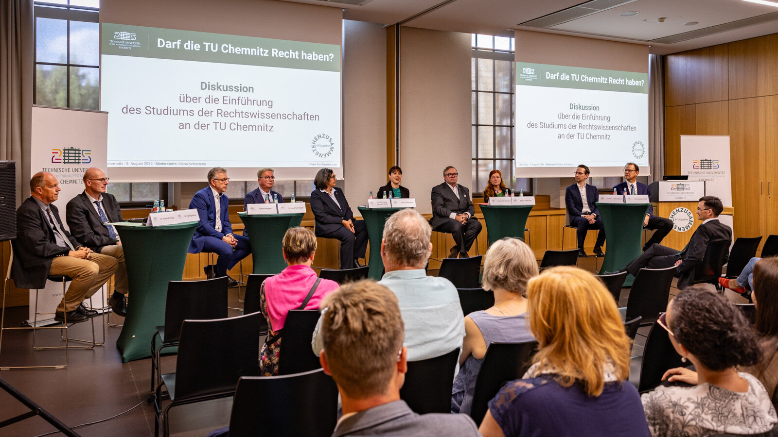 Sachsen fehlt der juristische Nachwuchs: Bis zum Jahr 2033 gehen voraussichtlich rund 850 sächsische Richterinnen, Richter, Staatsanwältinnen und Staatsanwälte, 1.370 Rechtsanwältinnen und Rechtsanwälte sowie 60 Notarinnen und Notare in den Ruhestand, so die Prognose des sächsischen Justizministeriums vom Herbst 2023. Eine ähnliche Ruhestandswelle wird für Juristinnen und Juristen in der Staats- und Kommunalverwaltung und der Wirtschaft erwartet. Ein Studium der Rechtswissenschaften ist in Sachsen nur noch an der Universität Leipzig möglich, nachdem die Juristische Fakultät an der TU Dresden zum 1. September 2018 geschlossen wurde. Diese steigenden Herausforderungen der Fachkräftebedarfsdeckung im Bereich Rechtswissenschaften wird auch vom sächsischen Kabinett in der im Februar 2024 beschlossenen Hochschulentwicklungsplanung 2025plus anerkannt. Dort heißt es wörtlich: „Im Hinblick auf die zunehmenden Schwierigkeiten, ausreichend juristischen Nachwuchs für die Rechtspflege, die Verwaltung und die Wirtschaft vor allem im ländlichen Raum zu gewinnen, sollen entsprechende Maßnahmen, gegebenenfalls die Einrichtung des Studienfachs Rechtswissenschaft an einer weiteren Hochschule, geprüft werden.“ Dafür macht sich die Technische Universität Chemnitz stark und hat am 5. August 2024 zu einer öffentlichen Podiumsdiskussion zum Thema „Darf die TU Chemnitz Recht haben?“ mit Vertreterinnen und Vertretern aus der Rechtspflege, der Anwaltschaft, der Wirtschaft und der Wissenschaft eingeladen, um Lösungsansätze aufzuzeigen und eine entsprechende Initiative zu starten (Hinweis: Deren Kernaussagen sind in der Bilder-Galerie zu finden).