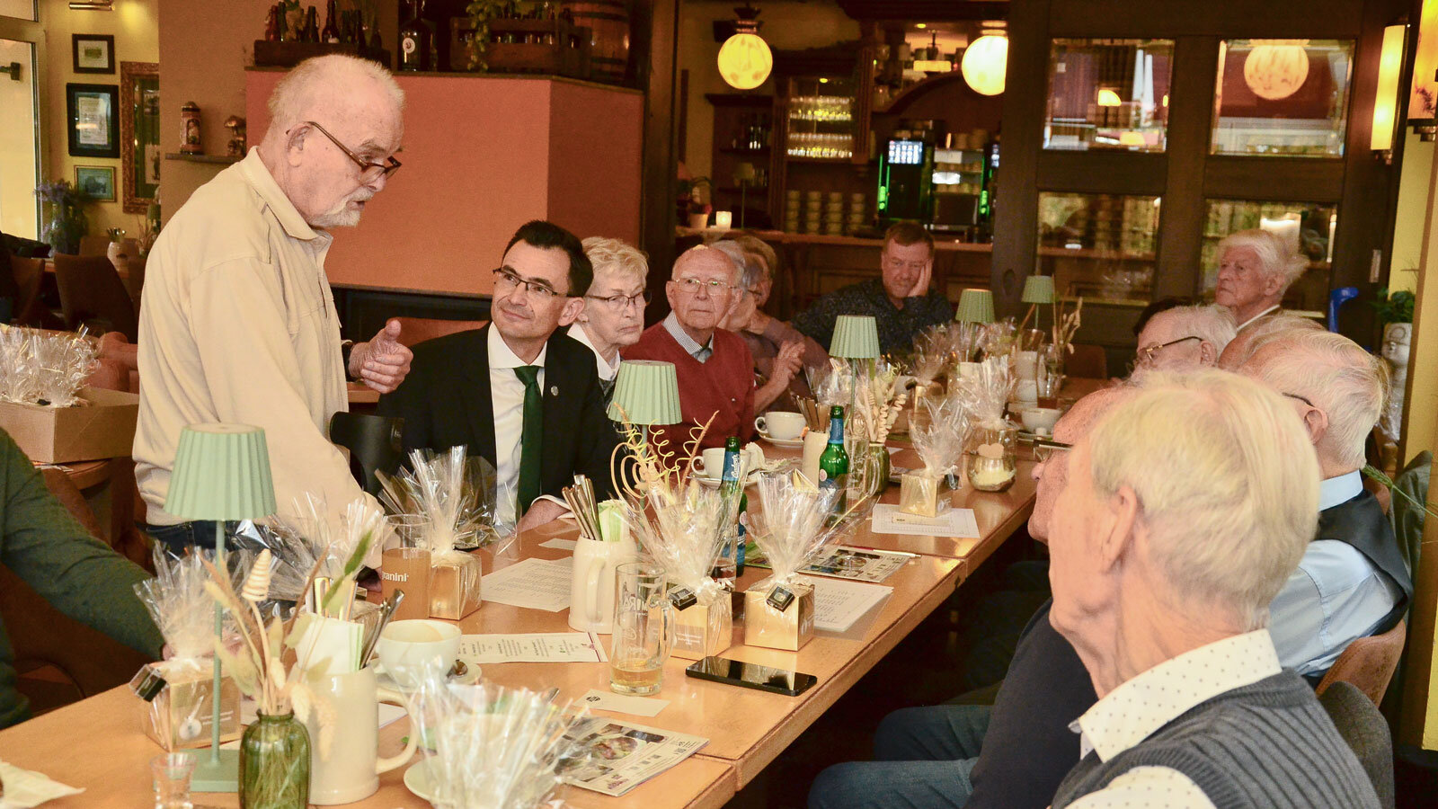 Erwin Feige (stehend), einer der Organisatoren der jährlichen Treffen der „53er“, freute sich sehr über die Anwesenheit von TUC-Rektor Prof. Dr. Gerd Strohmeier (rechts daneben) und berichtete gern von der Studienzeit an der damaligen Hochschule für Maschinenbau, einer Vorläufereinrichtung der TU Chemnitz. Foto: Diana Schreiterer