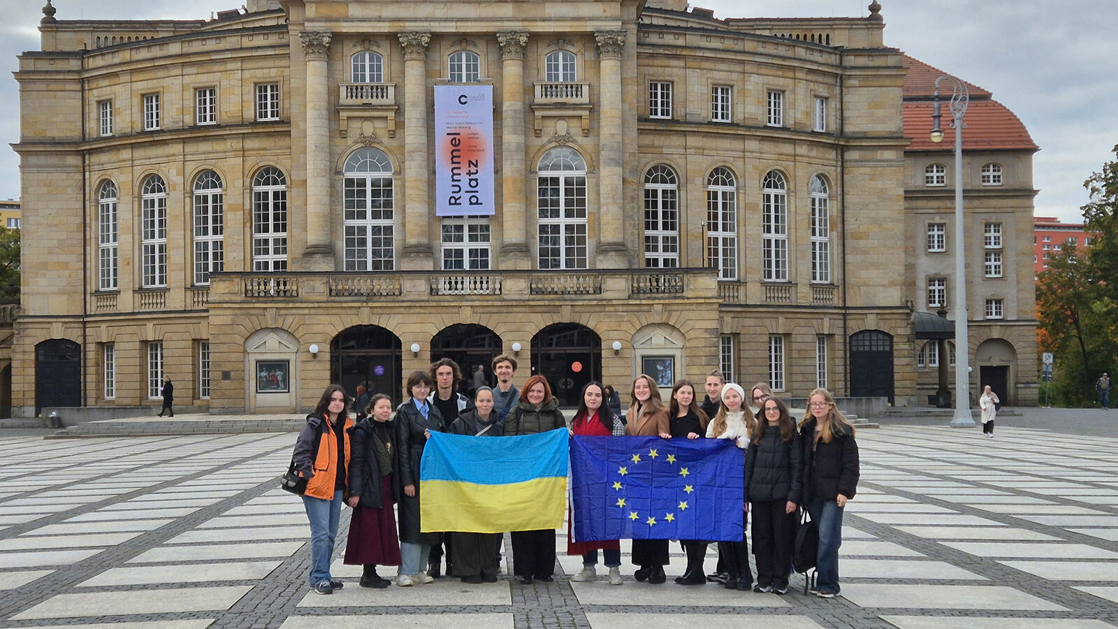 Studierende aus Lwiw vor dem Gebäude des Chemnitzer Opernhauses. Foto: Nicolai Teufel -