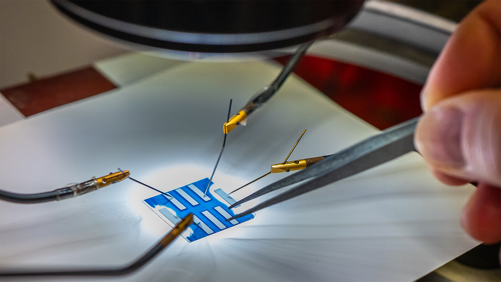 Eine (ausgeschnittene) gedruckte Solarzelle wird elektrisch vermessen. Die rechteckigen Kontakte der Solarzelle befinden sich auf der Rückseite und werden mit Messspitzen angetastet. Foto: Martin Mellendorf -
