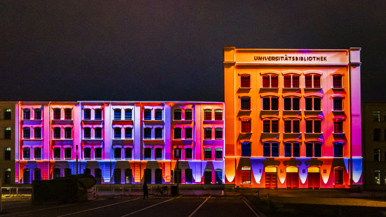 So angestrahlt wie beim Lichtkunstfestival „Light our Vision“ wird die Universitätsbibliothek der TU Chemnitz zur "Spätschicht" nicht, aber interessante Einblicke sind garantiert. Foto: Jacob Müller
