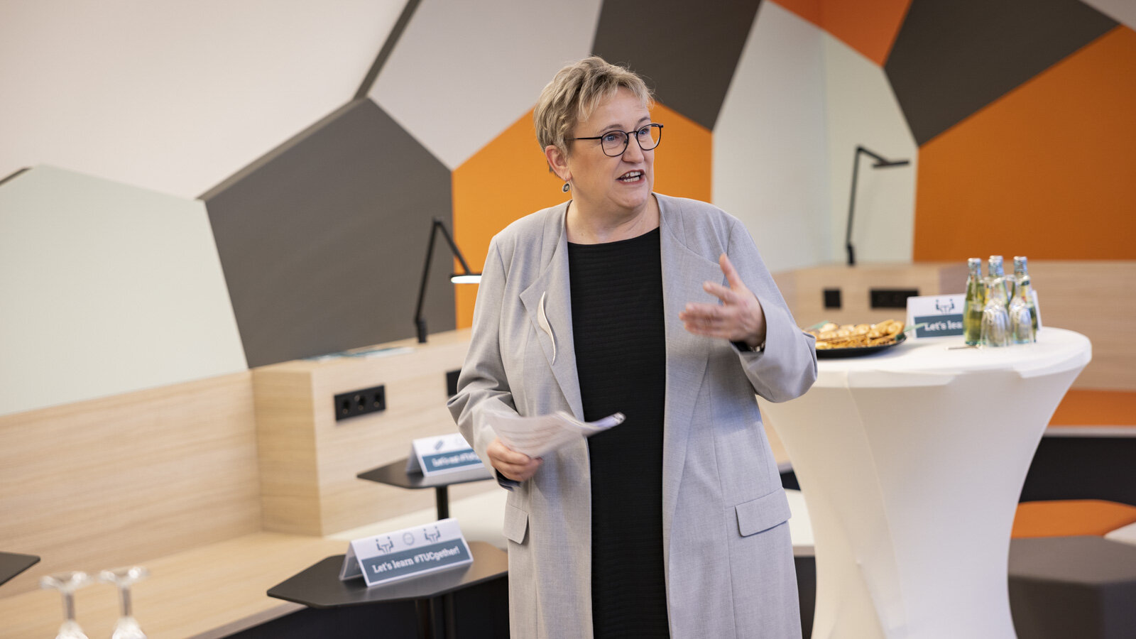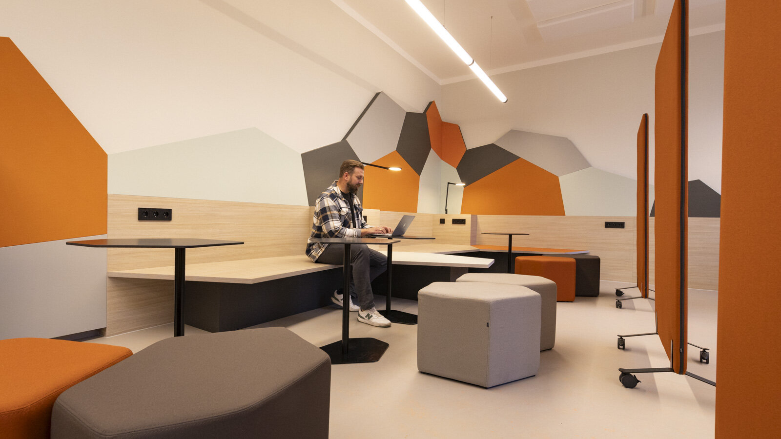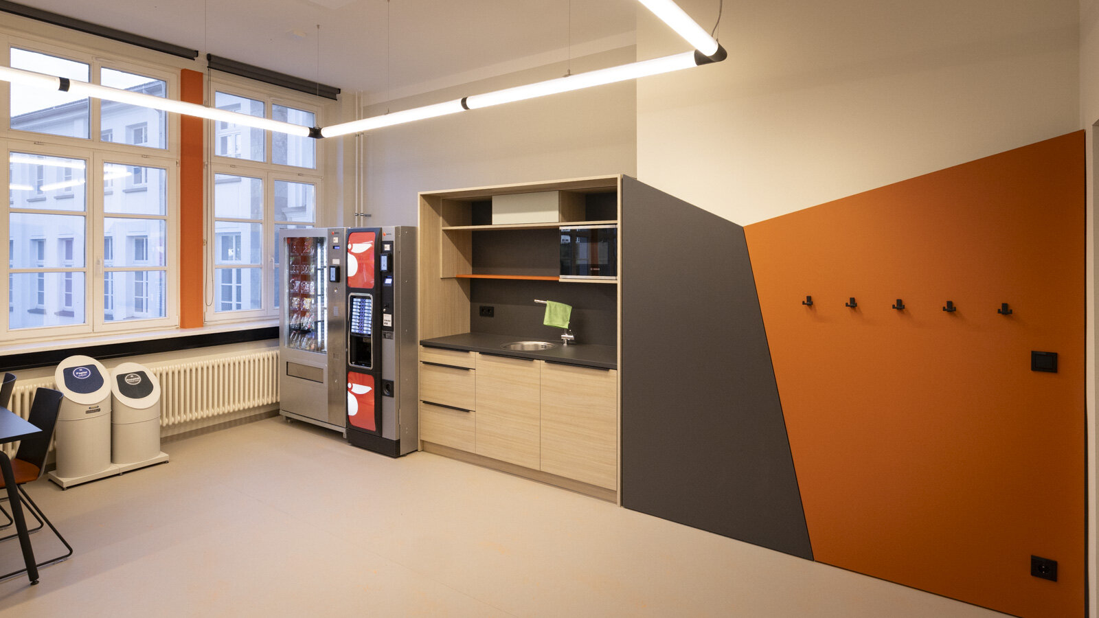 Klappbare Tische, stapelbare Stühle, rollbare Trennwände und eine Sitzinsel ermöglichen nun eine variable Raumnutzung. Zukünftig ist noch die Integration eines Bildschirms zur Unterstützung von Präsentationen für digitales Arbeiten geplant. Ob klassisch am Tisch, in der Sitzbankecke oder an der Arbeitstheke, der neue Common Room ist überall mit Steckdosen ausgestattet. Eine dezente, dimmbare Beleuchtung unterstützt zudem unterschiedliche Nutzungssituationen. Besonders wichtig für Universitätsangehörige, die in der Erfenschlager Straße 73 verortet sind, ist die Küchenzeile. Hier sorgen ein Snack- und Getränkeautomat, ein Kühlschrank, Warmwasser und eine Mikrowelle dafür, dass man in den Pausen Snacks zubereiten kann.