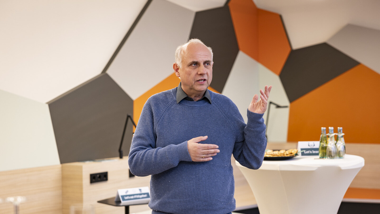 Prof. Dr. Guntram Wagner, geschäftsführender Direktor des Instituts für Werkstoffwissenschaft und Werkstofftechnik, hob lobend hervor, dass bei der Raumgestaltung Elemente aus dem Bereich der Metallografie unter anderem beim Design der Wandelemente verwendet wurden. Foto: Jacob Müller -