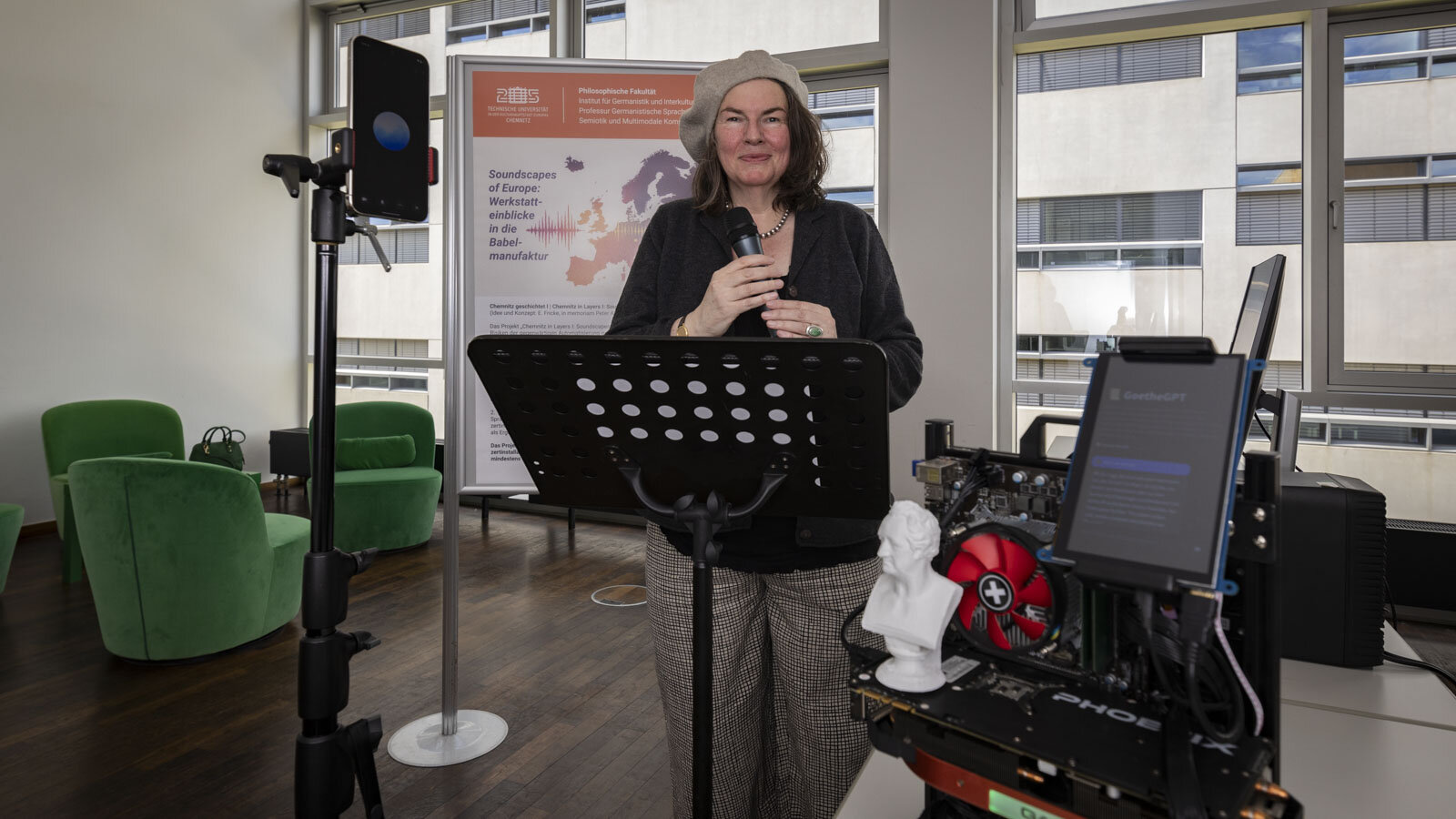 Prof. Dr. Ellen Fricke, Inhaberin der Professur Germanistische Sprachwissenschaft, Semiotik und Multimodale Kommunikation, demonstrierte bereits beim letzten TUCtag das Kulturhauptstadt-Projekt „Soundscapes of Europe“ und das Masterabschlussprojekt „GoetheGPT“ von Maximilian Paolucci. Foto: Jacob Müller -