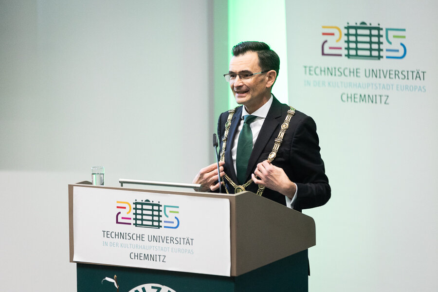 Prof. Dr. Gerd Strohmeier, Rektor der TU Chemnitz, gratulierte in seiner Begrüßung allen Preisträgerinnen und Preisträgern sehr herzlich und würdigte deren herausragende Leistungen – auch durch das Tragen seiner Amtskette. Foto: Steve Conrad -