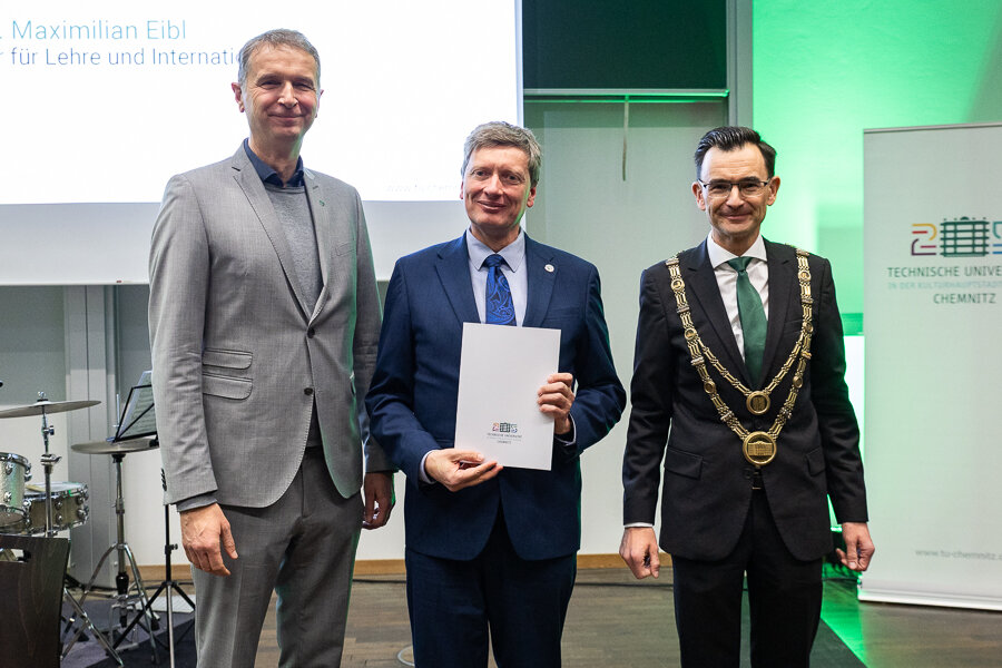 Der „Lehrpreis Herausragende Lehre“ wurde in diesem Jahr an mehrere Lehrende vergeben. Geehrt wurde Prof. Dr. Matthias Werner (Mitte), Inhaber der Professur Betriebssysteme. Er nahm den Preis von Prof. Dr. Gerd Strohmeier (r.), Rektor der TU Chemnitz, sowie Prof. Dr. Maximilian Eibl, Prorektor für Lehre und Internationales, entgegen. Foto: Steve Conrad -