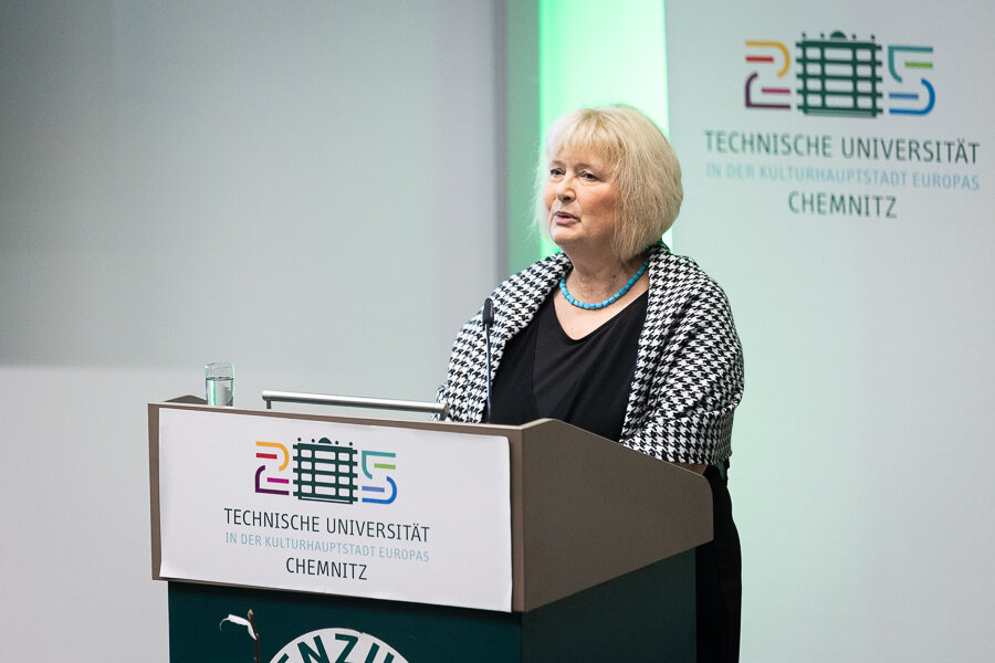 Karla Kebsch, Frauen- und Gleichstellungsbeauftragte der TU Chemnitz, stellte die Namensgeberinnen der Eleonore-Dießner- und Marie-Pleißner-Preise vor. Diese Preise werden bereits seit 2013 an der Universität vergeben. Foto: Steve Conrad -