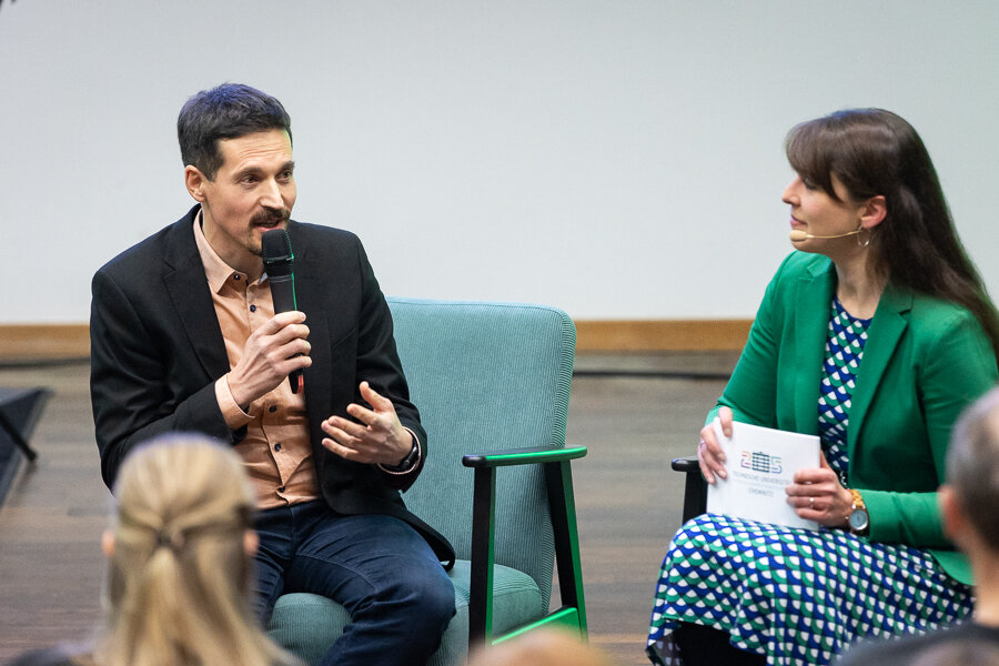 Prof. Dr. Thomas Basler, Inhaber der Professur Leistungselektronik und Nominierter für den „Deutschen Zukunftspreis – Preis des Bundespräsidenten für Technik und Innovation“ im Jahr 2024, erläuterte im Gespräch mit Moderatorin Diana Schreiterer, wie es zur Nominierung kam, welche Erlebnisse er vor genau einem Jahr am Tag der Preisverleihung in Berlin hatte und was aus der gemeinsamen Entwicklung revolutionärer Energiesparchips mit der Infineon Technologies AG auf dem Weg zur Marktreife inzwischen wurde. Foto: Steve Conrad -