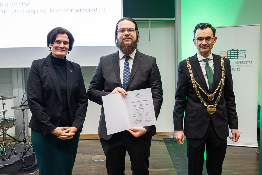 … Jun.-Prof. Arndt Leininger (Mitte), Ph.D., Inhaber der Juniorprofessur Politikwissenschaftliche Forschungsmethoden. Er nahm den Preis von Prof. Dr. Gerd Strohmeier, Rektor der TU Chemnitz, und Prof. Dr. Anja Strobel, Prorektorin für Forschung und Universitätsentwicklung, entgegen. Fotos: Jacob Müller/Steve Conrad -
