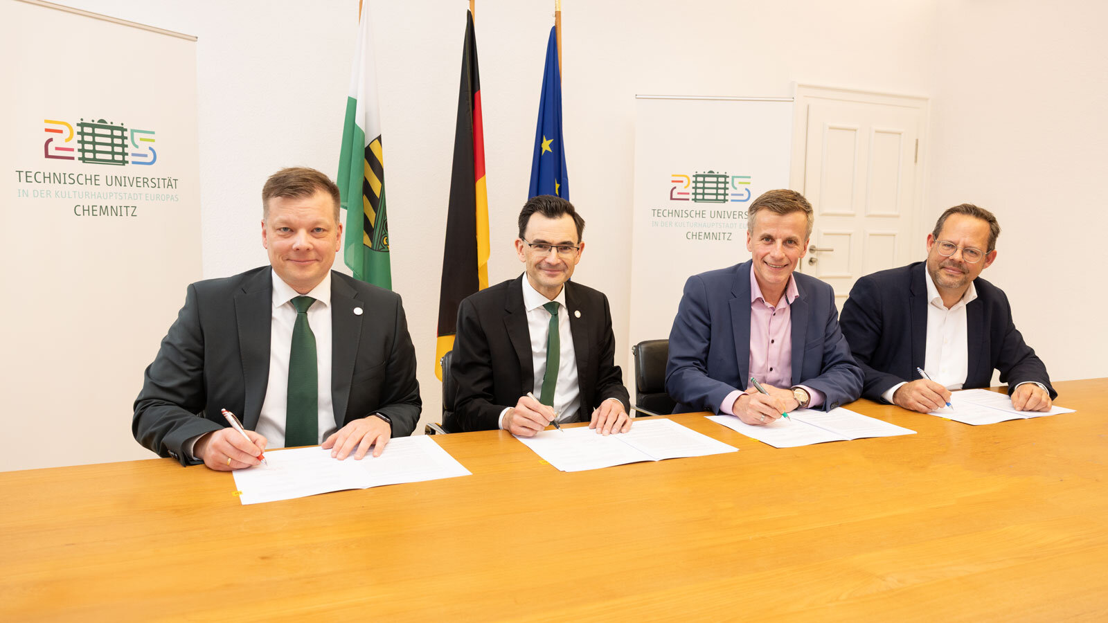 Am 8. Dezember 2025 unterzeichneten der medizinische Geschäftsführer der Klinikum Chemnitz gGmbH, Prof. Dr. med. Martin Wolz, und deren kaufmännischer Geschäftsführer Martin Jonas gemeinsam mit dem Rektor der Technischen Universität Chemnitz, Prof. Dr. Gerd Strohmeier, und dem Kanzler der TU Chemnitz, Peter Bernshausen, eine Kooperationsvereinbarung. Damit stellen beide Partnerinnen ihre Zusammenarbeit in Forschung und Transfer auf eine breitere und langfristige Basis. Ziel ist es, gemeinsame wissenschaftliche, technologische und klinische Potenziale zu bündeln und den Standort Chemnitz zu einem führenden Zentrum für Gesundheits- und Medizintechnikforschung zu entwickeln.