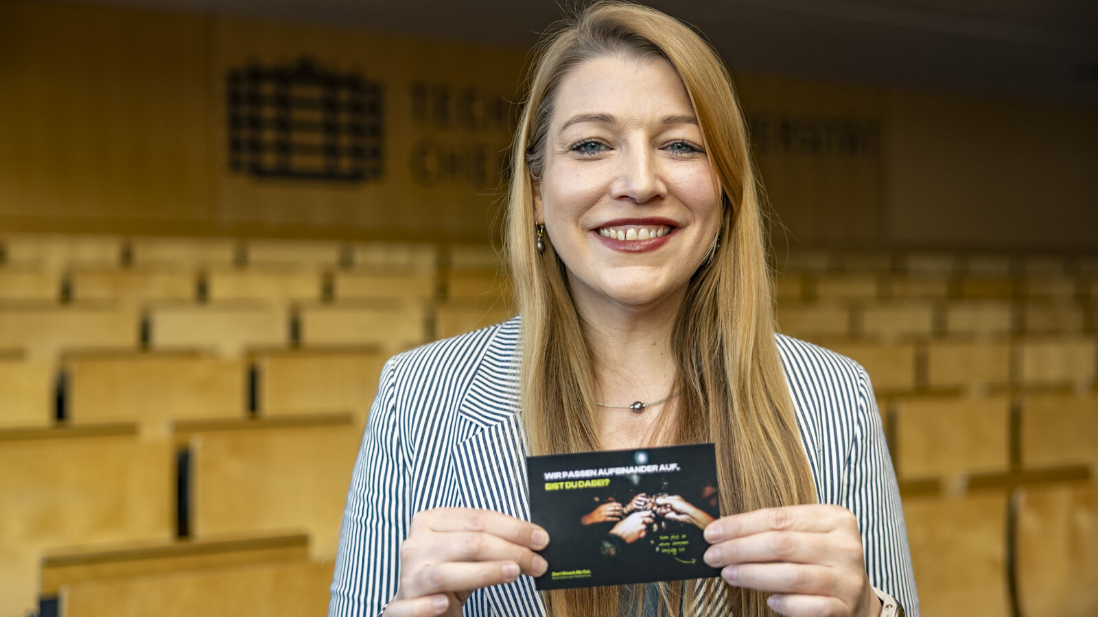 Jun.- Prof. Dr. Charlotte Förster präsentiert das Motiv der Edgar-Freecard-Kampagne zur Verbreitung der K.O.-Tropfen-Studie per Gratispostkarten. Foto: Jacob Müller
