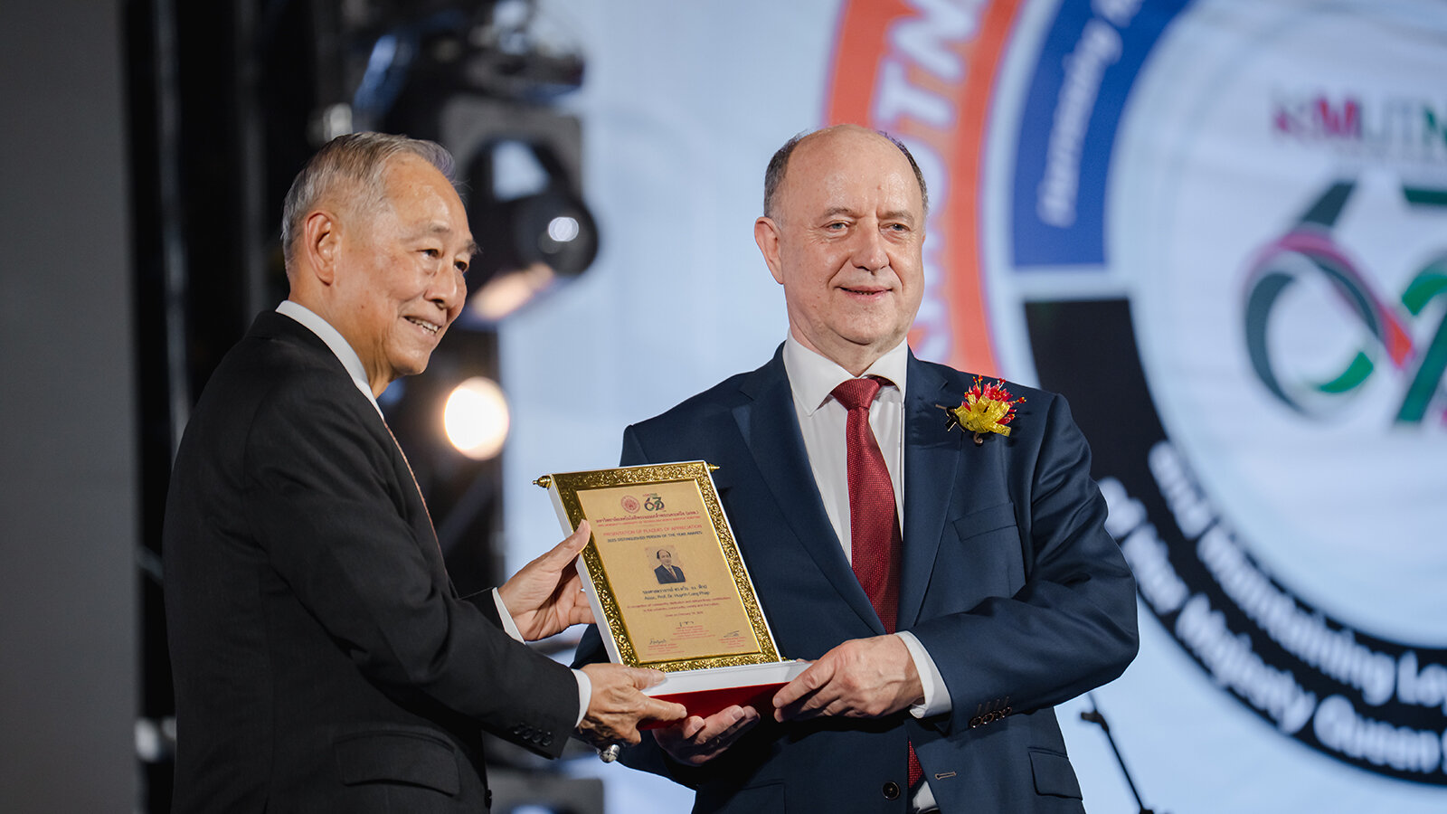 H. E. Air Chief Marshal Chalit Pukbhasuk überreichte die Urkunde zur Ehrung „Distinguished Person of the Year 2025“ der King Mongkut’s University of Technology North Bangkok an Prof. Dr. Lothar Kroll, Inhaber der Professur Strukturleichtbau und Kunststoffverarbeitung der TU Chemnitz. Foto: KMUTNB -