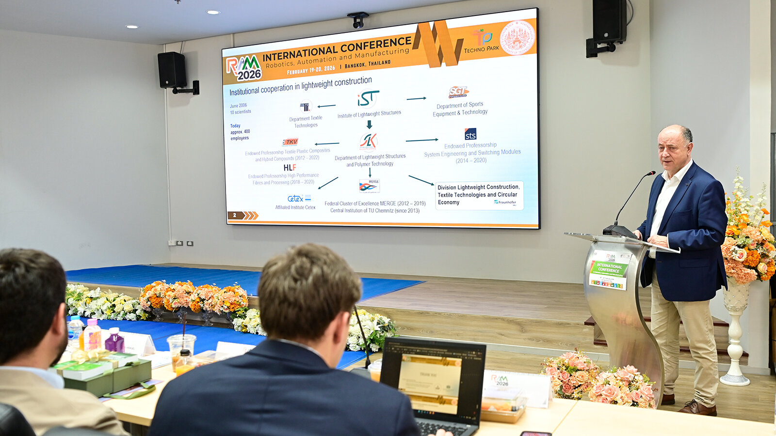 Parallel zu den Jubiläumsfeierlichkeiten fand vom 17. bis 20. Februar 2026 die internationale Fachkonferenz „RAM’26“ (International Workshop and Conference on Robotics, Automation and Manufacturing) statt. Kroll war es im Vorfeld gelungen, eine hochrangige sächsische Delegation für die Teilnahme zu gewinnen. Neben ihm nahmen von der TU Chemnitz unter anderem Prof. Dr. Thomas von Unwerth, Prorektor für Transfer und Weiterbildung sowie Inhaber der Professur Alternative Fahrzeugantriebe, und Prof. Dr. Jonas Hensel, Dekan der Fakultät für Maschinenbau und Inhaber der Professur Schweißtechnik, teil. Die Delegation wurde durch Prof. Dr. Sebastian Scholz (Hochschule Zittau/Görlitz sowie Leiter des Fraunhofer-Kunststoffzentrums Oberlausitz am Fraunhofer IWU) vervollständigt. Ebenfalls im Programm vertreten waren Prof. Dr. Steffen Fischer und Prof. Dr. Gianaurelio Cuniberti (beide TU Dresden), was den geschlossenen Auftritt der sächsischen Forschungslandschaft unterstrich.