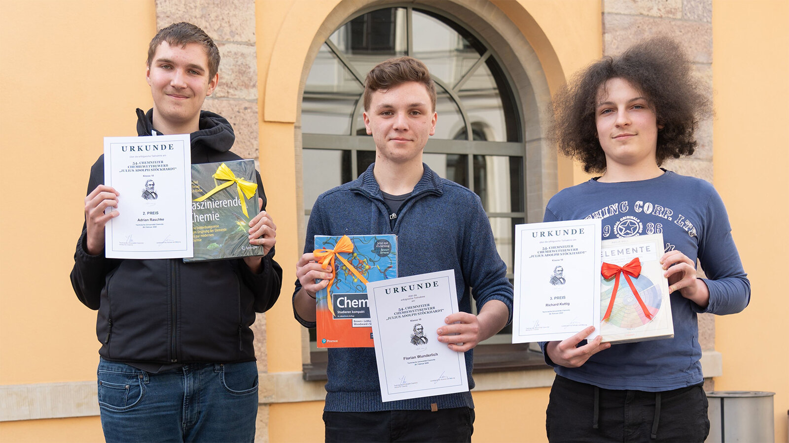Die drei Spitzenreiter des Chemiewettbewerbs trennten in diesem Jahr nur wenige Punkte beim Rennen um den ersten Platz. Diesen belegte Florian Wunderlich vom Goethe-Gymnasium Reichenbach. Dahinter platzierte sich Adrian Raschke vom Lessing-Gymnasium Hohenstein-Ernstthal. Das Spitzentrio komplettierte Richard Kuttig vom Julius-Motteler-Gymnasium Crimmitschau. Die Buchpreise mit Siegerurkunden nahmen die Gewinner aus den Händen der Organisatoren Prof. Dr. Klaus Stöwe, Inhaber der Professur Chemische Technologie an der TU Chemnitz, Ralf Matthes vom Landesamt für Schule und Bildung und Willy Pfau vom Gymnasium Einsiedel entgegen.