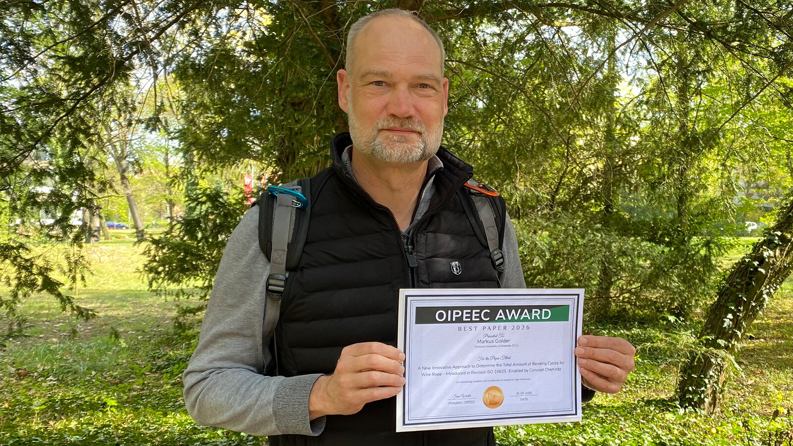 Der Inhaber der Professur, Prof. Dr. Markus Golder, stellte neue Entwicklungen in der Normung von Kranseilen vor. Für seinen Konferenzbeitrag wurde er mit dem „Best Paper Award“ ausgezeichnet. „Diese Ehrung unterstreicht die hohe wissenschaftliche Qualität und Relevanz der Arbeiten aus Chemnitz im Bereich der Seiltechnik“, so Golder. Darüber hinaus präsentierte Dr. Christoph Müller, Wissenschaftlicher Mitarbeiter der Professur FTM, aktuelle Forschungsergebnisse zur Modellierung von Restbruchkräften. Im Rahmen der Tagung wurde er zudem in das Management Board der Fachkonferenz OIPEEC gewählt und übernimmt damit künftig Verantwortung in dem internationalen Fachgremium.