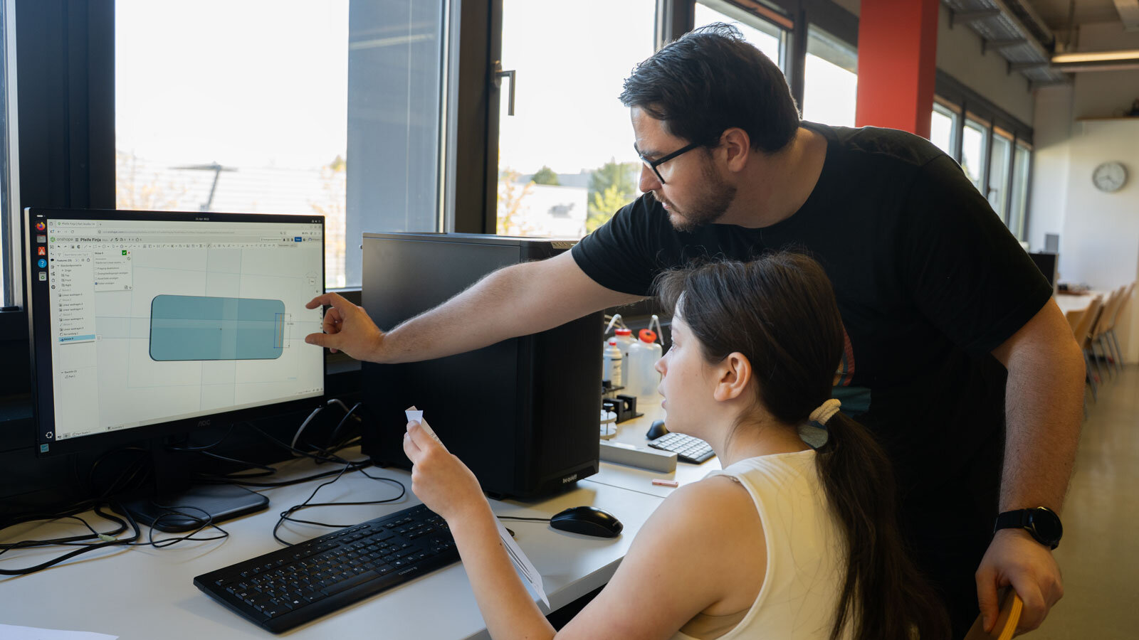 Dr. Martin Dehnert, wissenschaftlicher Mitarbeiter am Institut für Physik der TU Chemnitz und Leiter des Fortgeschrittenenpraktikums, unterstützte die Schülerin bei der Konstruktion ihres eigenen Klangkörpers. Foto: Anne Eichhorn -