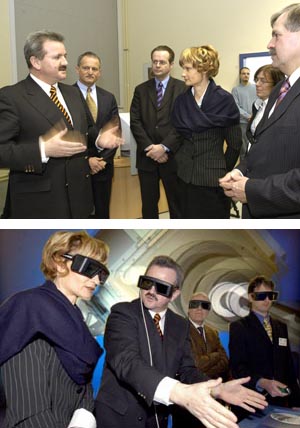 Bild oben: Prof. Dr. Reimund Neugebauer (l.), Dekan der Fakultät für Maschinenbau, begrüßt Barbara Ludwig, Sächsische Staatsministerin für Wissenschaft und Kunst (4.v.l.), Prof. Dr. Klaus-Jürgen Matthes (r.), Rektor der TU Chemnitz, und Eberhard Alles (3.v.l.), Kanzler der TU, im "Virtual Reality Center Production Engineering" seiner Fakultät. Bild unten: Prof. Dr. Reimund Neugebauer erläutert der Wissenschaftsministerin die Arbeit im VRCP-Labor. Fotos: Ulf Dahl/Freie Presse |