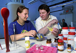 Der Polymerchemiker Prof. Dr. Stefan Spange und seine wissenschaftlichen Mitarbeiter Isabelle Roth und Andreas Seifert (im Hintergrund) untersuchen im Festkörper-NMR-Messlabor der TU Chemnitz Kieselgel-Partikel, auf die ein funktionalisiertes Polyvinylamin, kurz PVAm, chemisch aufgebracht wurde. Um die unlöslichen Strukturen des Hybridmaterials mittels Kernspin-Resonanz-Spektroskopie (NMR - Nucleus Magnetic Resonance) zu betrachten, muss die Probe im Mörser zerkleinert werden. (Foto: TU Chemnitz / Uwe Meinhold) |