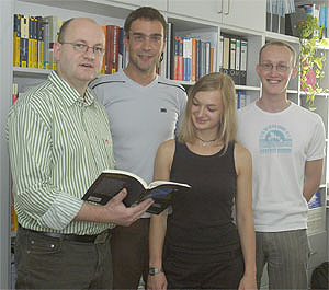 Prof. Dr. Peter Benner mit den Studierenden seiner Forschungsgruppe André Schneider, Susan Dürigen und René Günzel (v.l.) Foto: Christine Kornack |