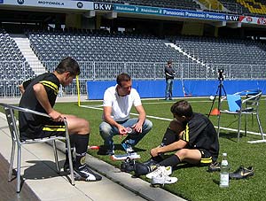 Clemens Müller erläutert im Stade de Suisse in Bern (Schweiz) zwei Profifußballern die Tests an den neuen Fußballschuhen. Foto: Thorsten Sterzing |