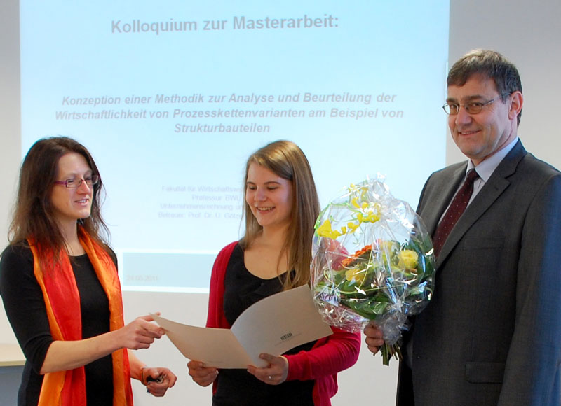 Prof. Dr. Silke Hüsing (l.), Vorsitzende des Prüfungsausschusses, Sarah Zönnchen und Prof. Dr. Uwe Götze, Inhaber der Professur Unternehmensrechnung und Controlling, nach der Verteidigung der Masterarbeit zum Thema "Konzeption einer Methodik zur Analyse und Beurteilung der Wirtschaftlichkeit von Prozess-kettenvarianten am Beispiel von Strukturbauteilen". Foto: privat