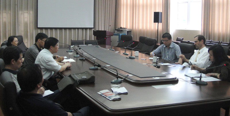 Mit dem Präsidenten der Lehrerbildungsuniversität Jiangxi in Nanchang, Prof. Guo (Mitte der linken Tischseite), sprach Prof. Bank (2.v.r.) über die Beteiligung deutscher Vokationomen an einer Berufsbildungskonferenz im kommenden Herbst. Übersetzt wurden die Gespräche in China von Huojin Xiong (3.v.r.), der an der TU Chemnitz promoviert. Foto: Lehrerbildungsuniversität Jiangxi -