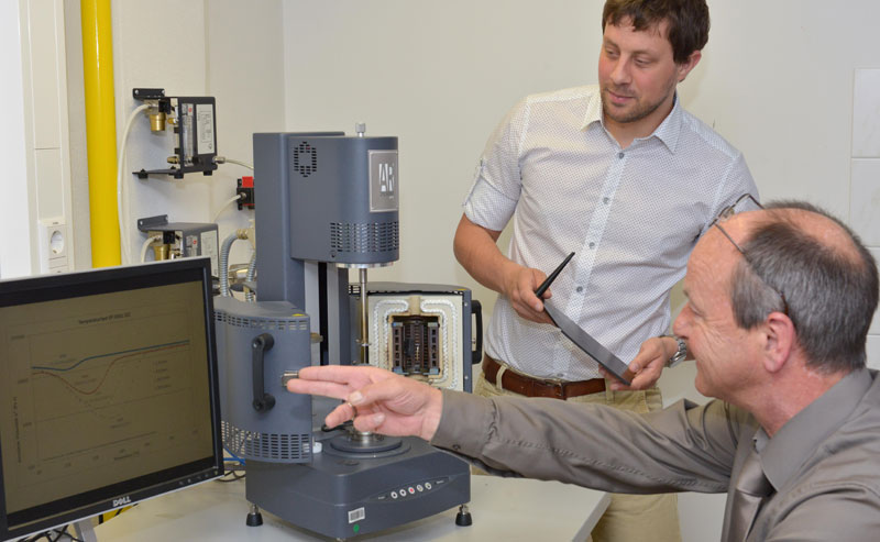 Prof. Dr. Michael Gehde (vorne) und Sascha Englich von der Professur Kunststoffe der TU Chemnitz untersuchen mit einem Rheometer das Fließverhalten einer Duroplastformmasse. Die Wissenschaftler suchen ein geeignetes duroplastisches Material, das für Bauteile des Axialflussmotors eingesetzt und im Spritzguss-Verfahren in Serie verarbeitet werden kann. Der auf dem Bildschirm dargestellte Verlauf der Messung zeigt, dass der untersuchte Werkstoff bei einer Temperaturerhöhung zunächst erweicht um dann zu härten. Für die Verarbeitung der Werkstoffe ist entscheidend, wann die Härtung einsetzt und wie schnell sie abläuft. Foto: Philip Knauth
