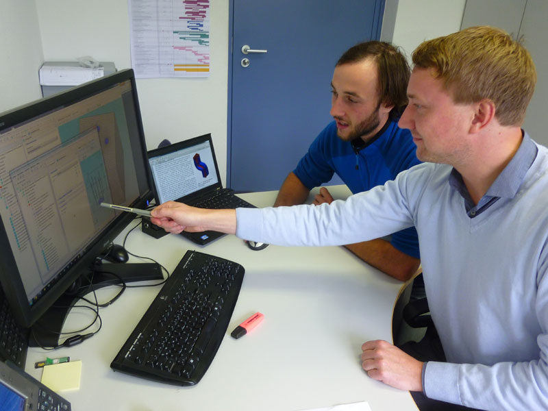Sebastian Flemmig (l.) und Dr. Henning Zeidler von der Professur Mikrofertigungstechnik besprechen die nächsten Schritte zur Erforschung von hocheffizienten Wärmeleitern mit Graphen-Einsätzen innerhalb des THERMACO-Projekts. Foto: privat