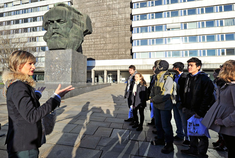 Stop at the Karl Marx Monument: Mayor Barbara Ludwig told the students of the history of the bust, which is the second largest free standing bust of the world after the Egyptian Sphinx. Picture: Sven Gleisberg -