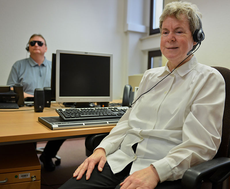 Auch Claudia Schwarz, die im Dezernat Haushalt und Wirtschaft für Beschaffung, Call Center und IT zuständig ist und seit Jahren mit Ursula Steinbrich und Volker Steinert zusammen arbeitet, ist von der Arbeit der beiden begeistert. "Gerade die Lockerheit im Umgang mit ihrer Blindheit ist erstaunlich und es ist schon außergewöhnlich, mit welcher Selbstverständlichkeit die beiden ihre Arbeit erledigen. Beim Zusammenarbeiten merkt man keine Einschränkungen", stellt Schwarz fest. "Außer vielleicht beim Lesen von PDFs, soweit ist die Technik dann doch noch nicht", erwidert Steinbrich lachend.