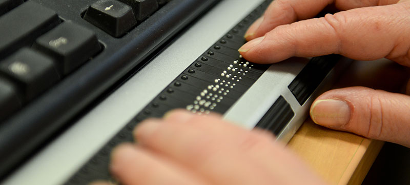 Da die beiden Mitarbeiter blind sind, befindet sich vor ihren Computern zusätzlich zur Tastatur eine Braillezeile, also ein Computer-Ausgabegerät, das Zeichen in Brailleschrift darstellt. Foto: Philip Knauth