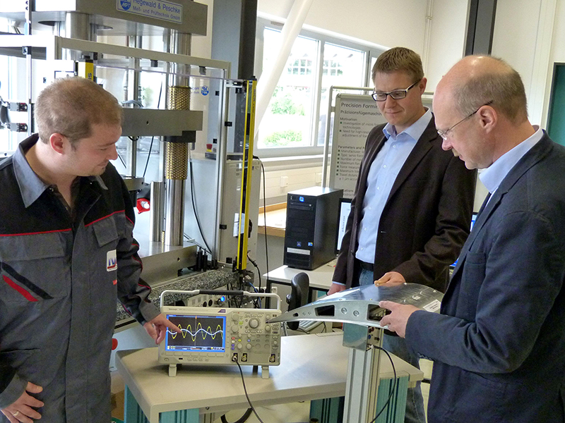 Prof. Dr. Welf-Guntram Drossel (on the right), the spokesman of CRC/TR 39, and Michael Müller (in the center), designated managing director of CRC/TR 39, discuss with Benedikt Müller, a member of TU Chemnitz, the sensor-actuator of a formed sheet metal component. Photo: Fraunhofer IWU/Matthias Nestler