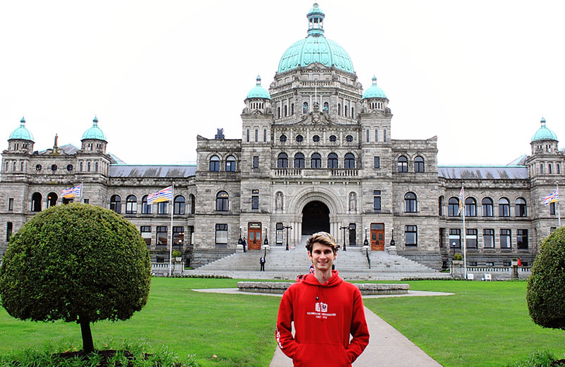 Der "Internationale Tag" bietet unter anderem Informationen zu einem Aufenthalt in Kanada. Zu den Studierenden, die dieses Angebot im aktuellen Wintersemester wahrnehmen, gehört Micele Ulbricht aus dem Master Medienkommunikation. Er zeigt, dass sich die Sweatshirts aus dem Unishop der TU Chemnitz auch vor dem Parlamentsgebäude von British Columbia in Victoria auf Vancouver Island gut machen. Foto: privat