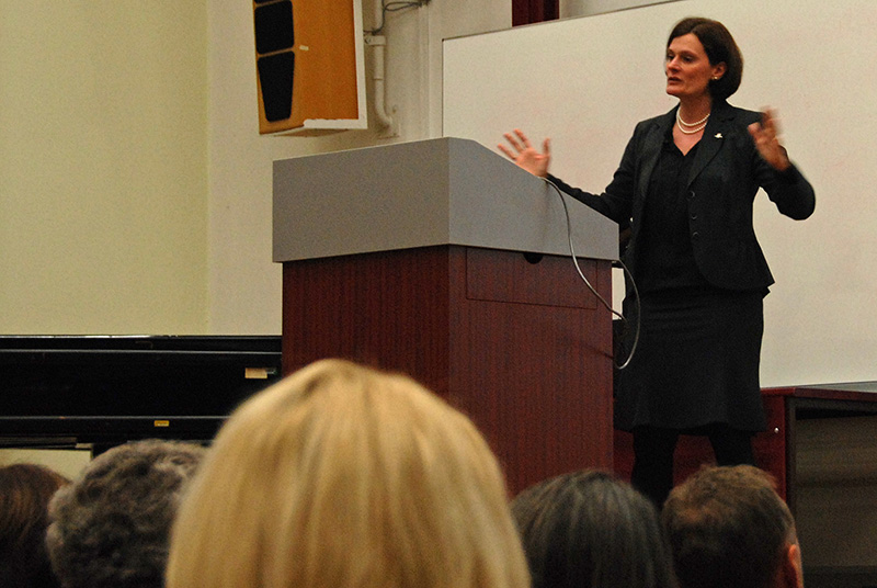 Prof. Dr. Anja Strobel referierte über die Freude am Denken: „In EEG-Untersuchungen, also bei der Darstellung der hirnelektrischen Aktivität, finden wir bei Personen mit höheren Ausprägungen im `Need for Cognition´ bereits Hinweise auf eine automatisierte, habitualisierte Hinwendung zu neuen Reizen, die vielleicht mit Informationsgewinn einhergehen, praktisch eine sehr schnelle Reaktion, bereits auf vorbewusster Ebene.“ Foto: Katharina Thehos