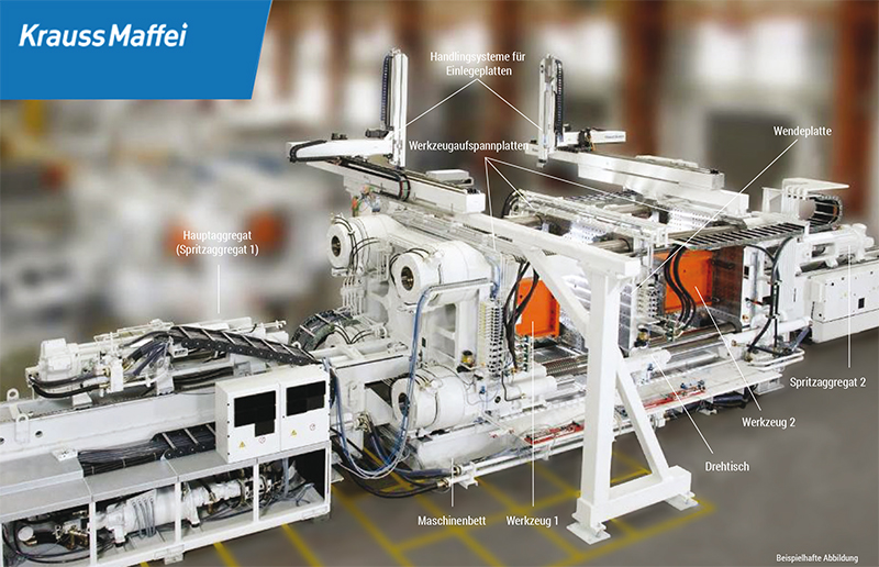 Structure of the MERGE machine – an entirely new developed multi-component injection moulding complex for merging various material systems for multifunctional lightweight construction. Graphics: KraussMaffei -