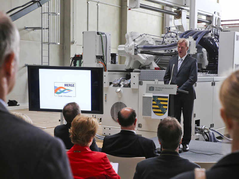 With the Federal Cluster of Excellence “Merge Technologies for Multifunctional Lightweight Structures” (MERGE), the Technische Universität Chemnitz is one of the winners of the Federal Excellence Initiative. This nationwide unique project includes around 100 scientists working in the area of technology fusion in lightweight construction. Their common goal is to merge manufacturing processes that today are separate in the processing of different material groups such as textiles, plastics and metals. Multi-component parts can thus be mass produced more cost- and energy-efficiently. In the future, multifunctionality will be achieved in one processing step only. The Federal Cluster of Excellence was established in 2012 within the Excellence Initiative of the federal and state governments at the TU Chemnitz. Through 2017, it will be funded with 34 million euros.
