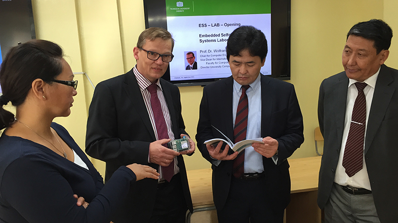 „Am 16. September 2015 war es endlich soweit“, freut sich Prof. Dr. Wolfram Hardt, Inhaber der Professur Technische Informatik. In Ulaanbaatar eröffnete das internationale ESS-Lab mit zunächst fünf vollständig ausgestatteten Programmierplätzen. „Die Begeisterung der Studierenden über die neuste Quadcore-Technologie einschließlich Sensorik und Kommunikationsschnittstellen ist riesengroß“, so Hardt, der zugleich Prodekan für Internationales der Fakultät für Informatik der TU Chemnitz ist. In Ulaanbaatar wurde er mit vielen Ideen für neue Anwendungen bestürmt. Prorektor und Kanzler der MUST sowie der zuständige Dekan ließen es sich nicht nehmen, der Laboreröffnung beizuwohnen und sie lassen wissen, dass in Kooperation mit der Stiftung Internationales Informatik- und Begegnungszentrum Sachsen, die internationale Nachwuchswissenschaftler fördert, ein länderübergreifender Wettbewerb für Studierende auf Grundlage dieser modernen Hardware-Plattform ausgeschrieben werden soll. „Schon bald wetteifern hier Studierende aus aller Welt um die besten Ideen“, sagt Prof. Hardt.