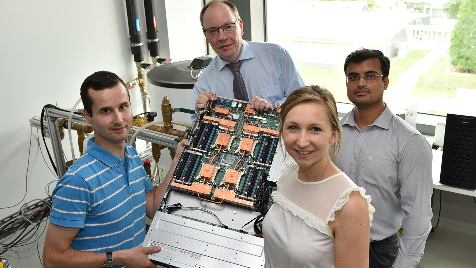 The Chemnitz researchers Thomas Oppelt (f.l.), Prof. Thorsten Urbaneck, Verena Rudolf, and Nirendra lal Shrestha from the Professorship of Technical Thermodynamics show that servers can be used for heating. Photo: Matthias Bilz