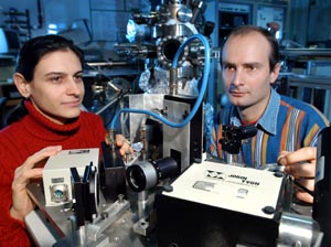 Die Diplom-Physiker Georgeta Salvan und Cameliu Himcinschi (v.l.) bei Einstellarbeiten an einem Versuchsaufbau zur Optischen Spektroskopie in einem Labor des Fachbereiches Halbleiterphysik der TU Chemnitz. Foto: Uwe Meinhold/TU Chemnitz |